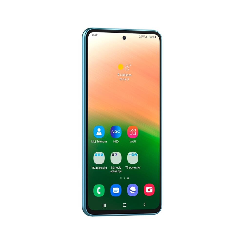 Samsung Galaxy A53 5G z zaslonom FHD+ Super AMOLED je oblikovan, da izstopa. Ambient Edge brezhibno združi kamero z ohišjem. S povezavo Hyperfast nemoteno pretakate in delite vsebine s prijatelji in družino. Mobitel vključuje 5-nanometrski osemjedrni procesor, ki omogoča večopravilnost. S 128/256 GB notranjega spomina in podporo za mikro SD-kartico do 1 TB boste imeli dovolj prostora za shranjevanje dragocenih trenutkov. Z brezkončnim-O zaslonom diagonale 16,5 cm boste uživali v živahni svetlosti, ki dosega 800 cd/m² tudi na prostem, hkrati pa zaščita za oči zmanjša modro svetlobo. Ujemite razločnejše in jasnejše posnetke s kamero s 64-MP OIS, razširite kot gledanja z ultra širokokotno kamero in prilagodite fokus z globinsko kamero ter se približajte podrobnostim z mikro kamero. Baterija s 5.000 mAh je zelo zmogljiva, mobitel pa napolnite super hitrim polnjenjem (25 W).